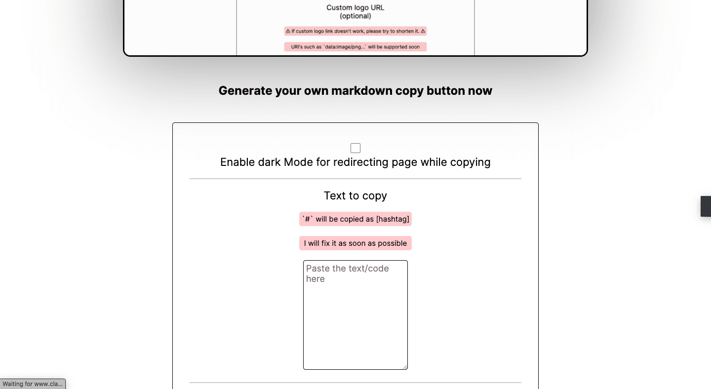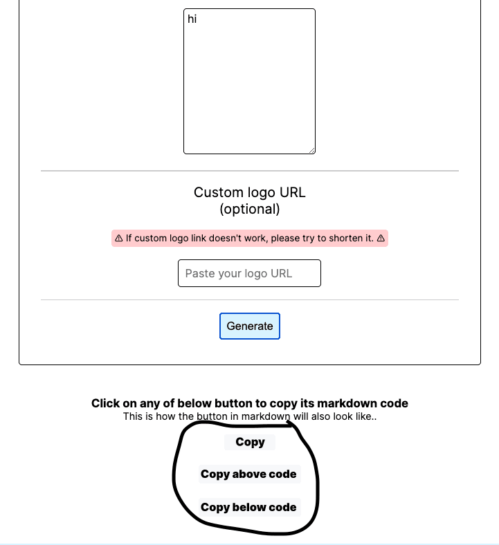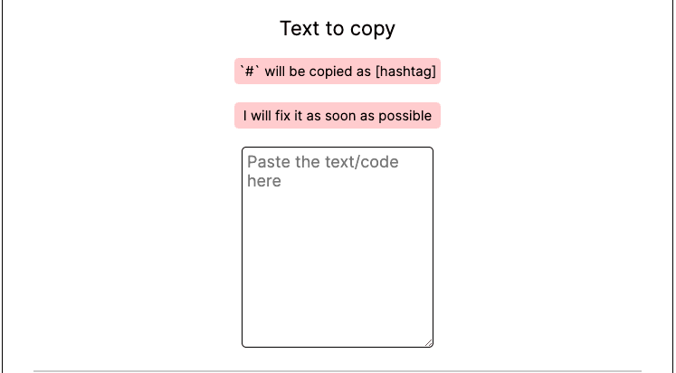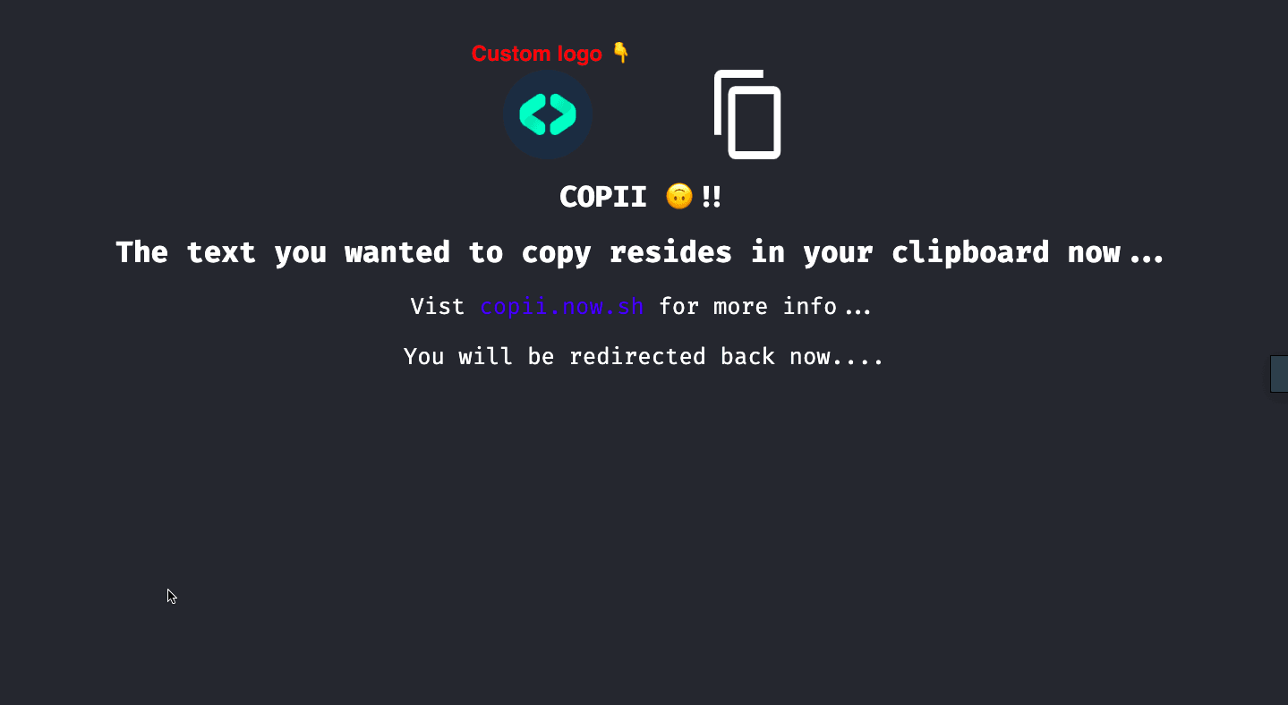 https://copii.vercel.app/?ct=hi( for example ) and the text/code gets copied to clipboard there. Now, the user will be redirected back to same part webpage/github readme back with the help ofHistory API - Paste the markdown code in your markdown file/readme file and you are good to go π²